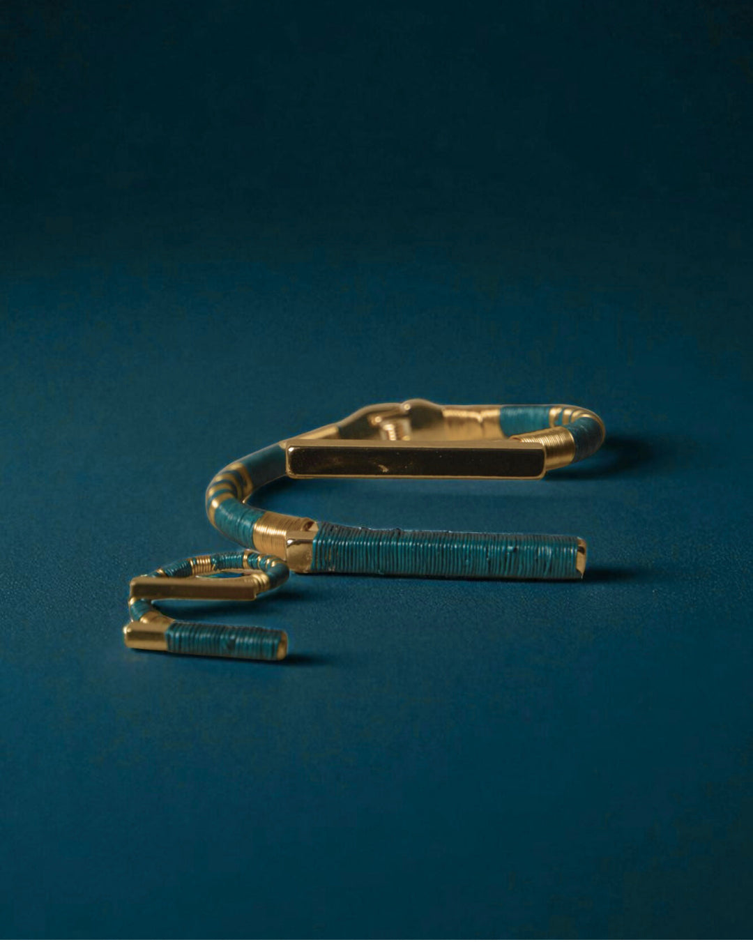 Pieza bañada en oro de 14k, terminada a mano con Wuerregue natural e hilos de cobre.